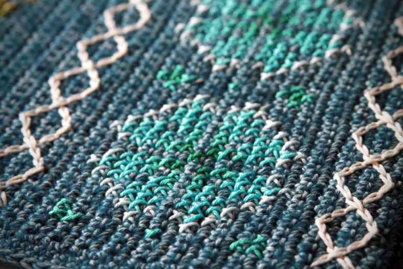 Week 9, the first week after the big center panel. Today we’re going back to the smaller embroidery sections, starting with a nice cartwheel design. You might have seen that the shawl is sort-of-mirrored on both sides of the back panel. Not in terms of motifs, but in terms of colours. When designing I made sure that the ‘look and feel’ of colours on one side matched those on the other side. So, we’re working with more or less the same colours as we did in week 4!