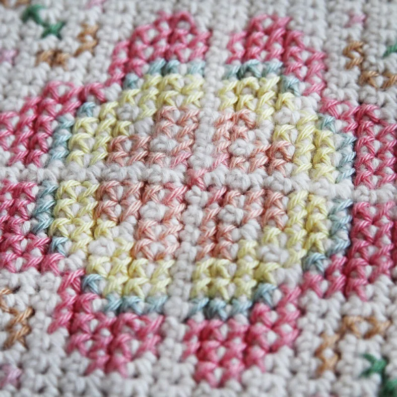 Yay! Deze week gaan we weer borduren. Ik weet dat jullie daar op hebben zitten wachten maarja, je moet een ondergrondje hebben voordat je kan borduren! Nu je je een weg door de 100+ rijen vasten hebt geworsteld is het tijd voor een borduur-beloning, toch? We gaan niet het hele rugstuk in 1 week borduren, dat zou een beetje teveel van het goede zijn. Hij is dus in twee weken verdeeld. Deze week doe je de eerste helft, wat de helft van deze bloem is plus alles daarvoor. Volgende week doen we dan de andere kant.