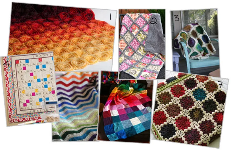 1. Fire blanket 2. Minky rag quilt 3. Sunny spread 4. Quilt scrabble throw 5. Ripple blanket 6. Elmer blanket 7. Older sister's blanket