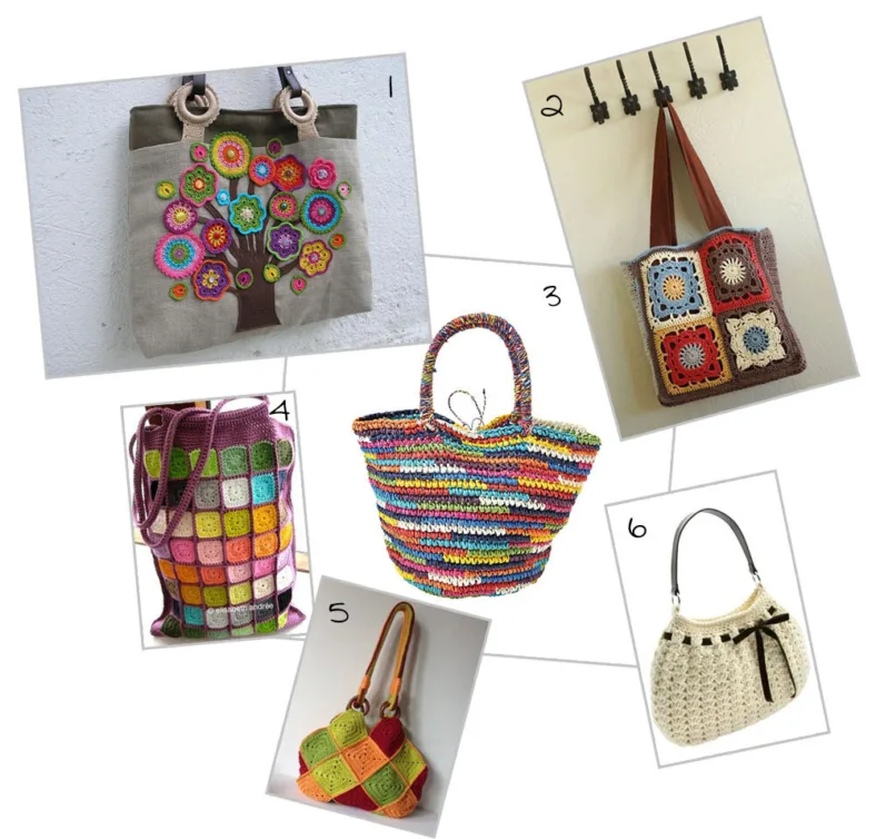 1. Crochet bag by Ana paula 2. Chic Granny tote bag from Cro Crochet 3. Pepe Jeans beachbag 4. Tiny squares bag by Elisabeth Andree 5. Square bag by Jellina-Creations 6. Crochet Hobo bag from Nordstrom, adjusted pattern by Dao Lam