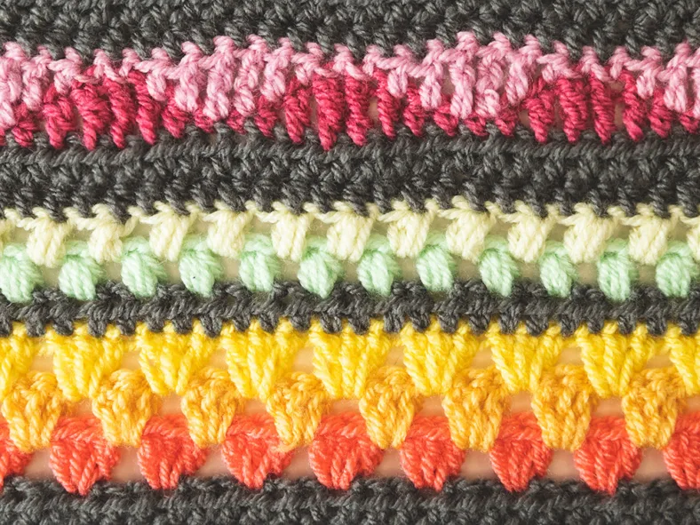 Row 149 (RS) Join Colour K with a ss in first st, begin-puff stitch in same st, *ch1, skip 1 st, puff stitch; repeat from * another 118 times, ch1, skip 1 st, 1dc in last stitch, cut yarn, turn. [1 begin-puff stitch, 119 puff stitches, 120 ch, 1 dc]
