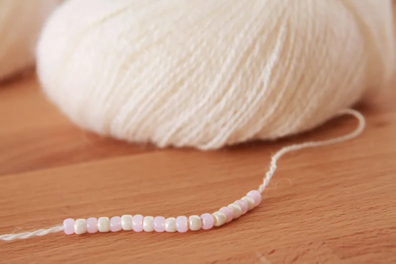 But there’s no fun in all white, So I got myself some tiny glass beads in blush pink and white. The pink was added because one of the accent colours of my wedding was pink. At this stage, all I had to go by was a swatch I made with completely different colours as I didn’t have any of the colours for the yarn or beads at home. So it was a bit of a gamble but honestly, you can’t really go wrong with white and another colour right?