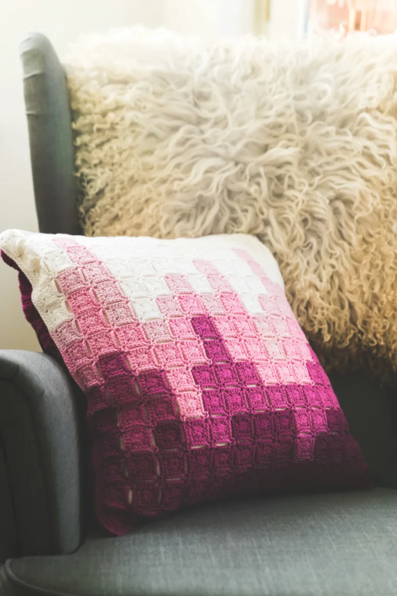 The back has buttons for fastening, meaning that you can change the inner pillow. I’ve opted for these purple glazed rustic buttons, they contrast nicely with the Tyrian purple background. I’ve used Scheepjes Catona, a mercerized cotton yarn. It creates that gorgeous stitch definition that you see.